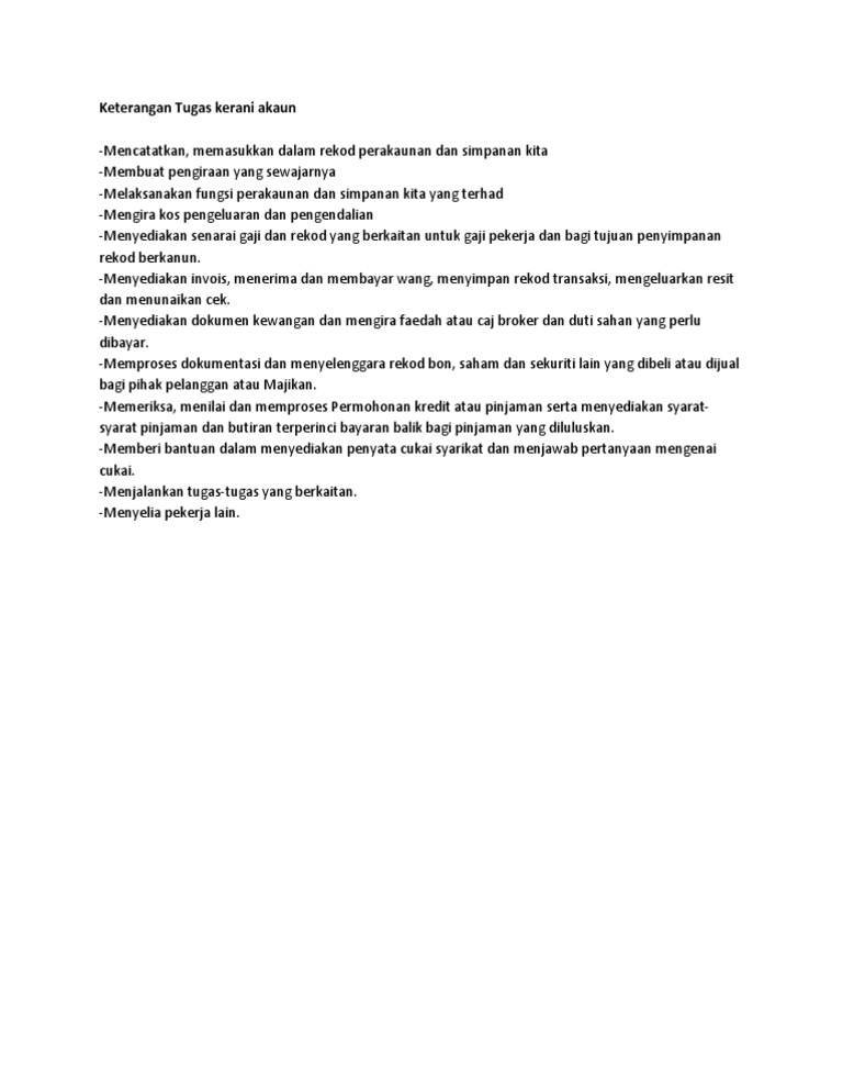 Pekerjaan kerani adalah sangat banyak dan permintaan pasaran atau sektor sangat tinggi sekali. Mengimbangi akaun atau apa yang lazim dikenali sebagai penyimpanan buku kemasukan berganda menyemak akaun itu tepat melengkapkan pulangan cukai membantu menyediakan akaun akhir seperti akaun untung rugi kunci kira-kira memproses invois jualan resit dan. Keterangan Tugas kerani akaun.