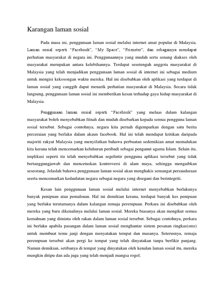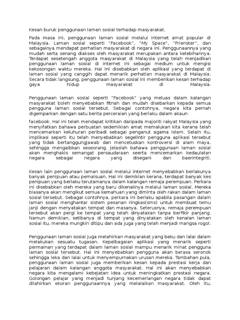 Kelihatannya mempunyai akaun di laman media sosial ini seakan menjadi satu kemestian dalam kehidupan masyarakat masa kini. Paparan foto wajah individu butiran peribadi dan maklumat lain juga merupakan kemudahan yang disediakan laman sosial Facebook. Karangan kebaikan dan keburukan media sosial spm.